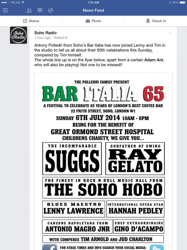 The show as held in Frith Street, Soho as a celebration for Bar Italia's 65th Anniversary