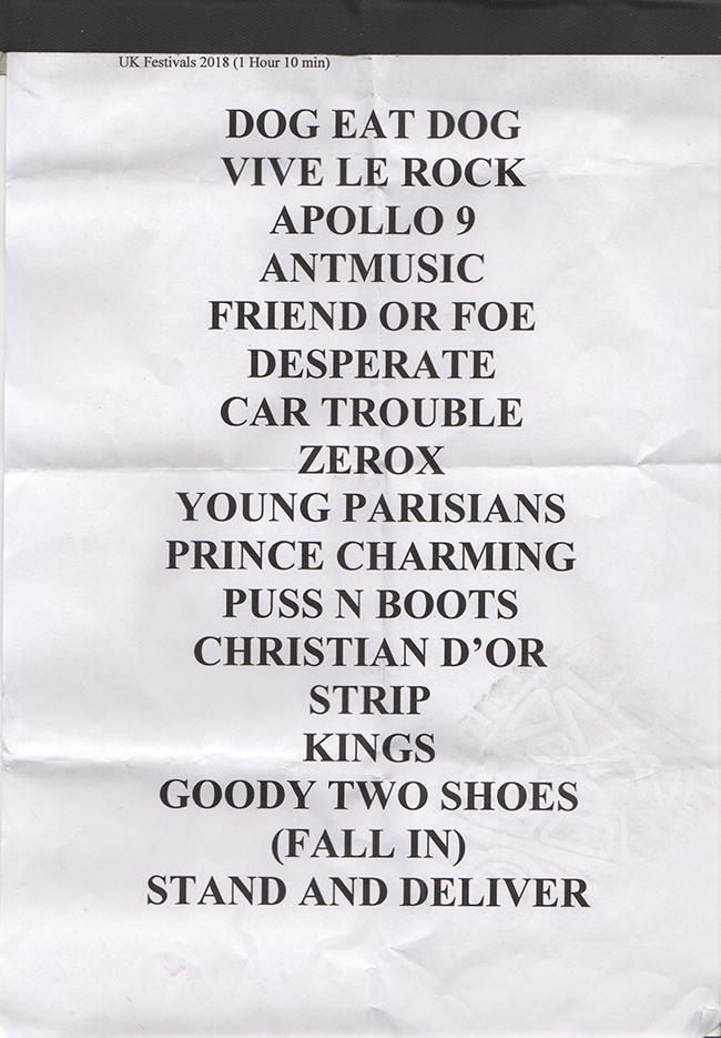 With stage time being tight, the band didn't leave the stage for their encore Stand and Deliver, they continued the set right through.