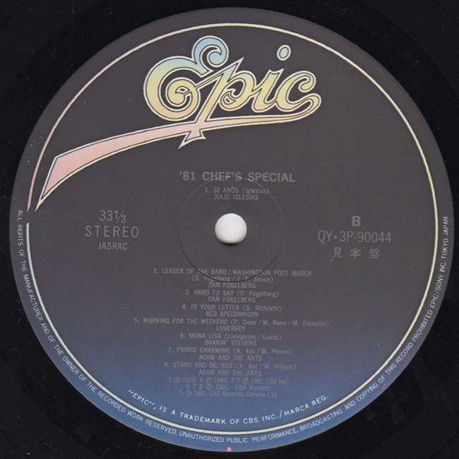 Side 2 Julio Inglesias - 33 Anos Dan Fogelberg - Leader of the Band Dan Fogelberg - Hard to Say REO Speedwagon - In Your Letter Loverboy - Working For The Weekend Shakin' Stevens - Mona Lisa Adam and the Ants - Prince Charming Adam and the Ants - Stand and Deliver