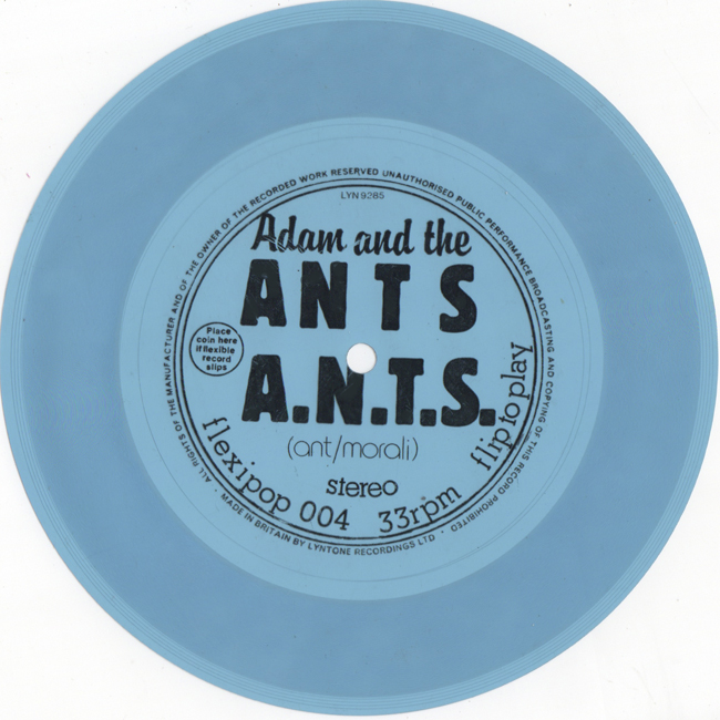 Adam and the Ants Country Label Catalogue Number Matrix numbers Format Release date A Side B Side Adam and the Ants take on the Village People song Y.M.C.A. with lyrics changed to suit Adam and the Ants, a live favourite for the band first played at their New Year's Eve Electric Ballroom performance in 1979. The blue flexi disc was given away free with Felexipop magazine in March 1981 ![]() The song A.N.T.S. was also featured on the limited edition vinyl LP The Flexipop album