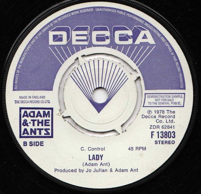 Adam and the Ants Country Catalogue Number Matrix numbers Format Release date A-side B-side 2 track UK promo release which is exactly the same pressing as the official release. The paper labels are white and blue and clearly state that the record is a Demonstration sample only. The record has exactly the same catalogue and matrix numbers as the standard release. |