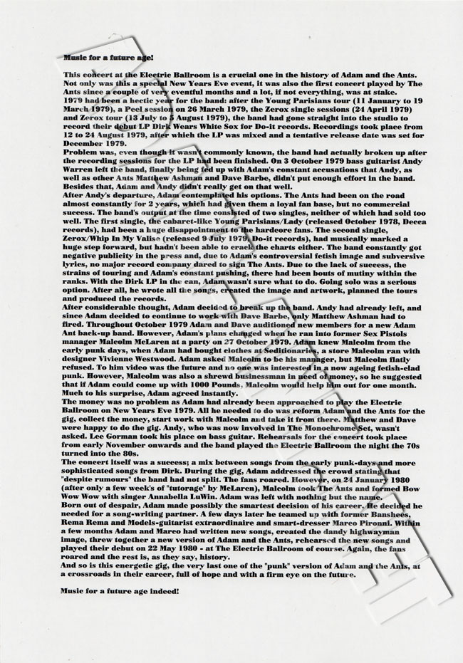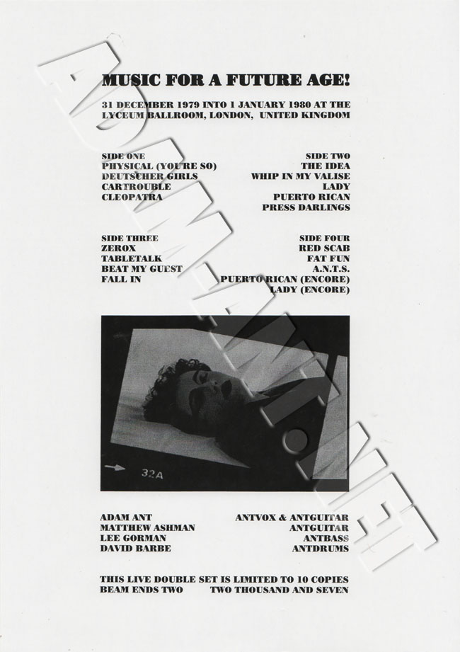 Double vinyl hand made release of Adam and the Ants New Year's Eve 1979 show at the Electric Ballroom, London. |