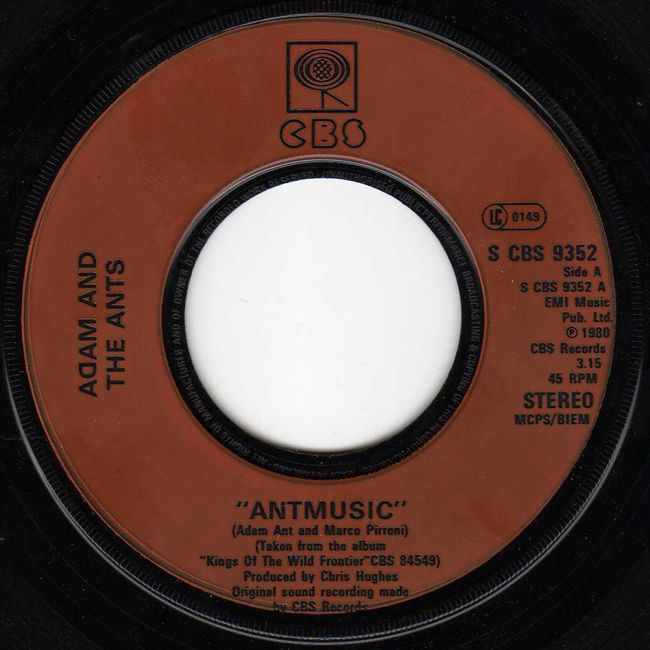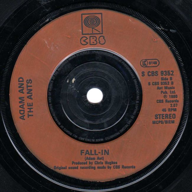 Adam and the Ants Country Label Catalogue Number Matrix numbers Format Release date A-side B-side The third single to be taken from the Kings of the Wild Frontier album. The front and back cover of the single were taken on board a ship moored on the Thames. These are also the first photographs taken of the whole of the band. The B-side, Fall in, is an old Ants song from 1977 co written with Lester Square. The ADAM AND THE ANTS font on the IML label for this pressing is in small bold font. |