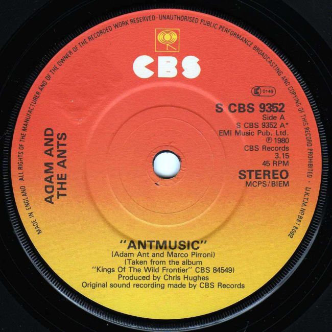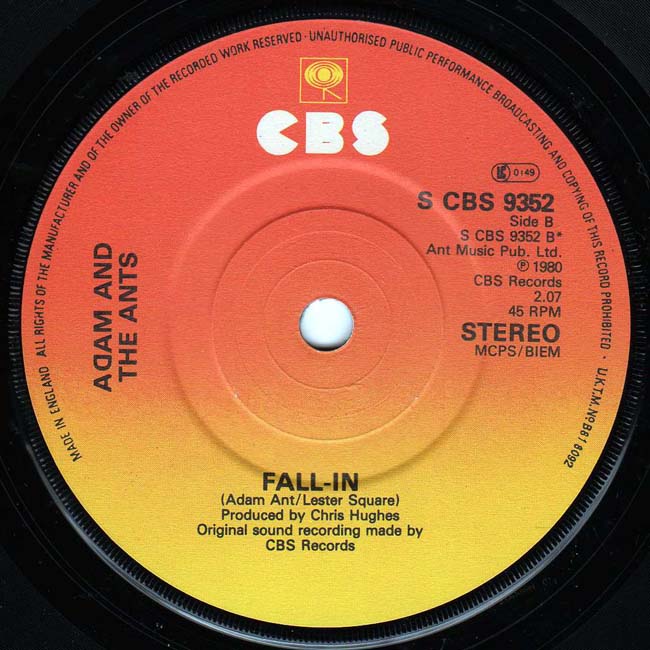 Adam and the Ants Country Label Catalogue Number Matrix numbers Format Release date A-side B-side The third single to be taken from the Kings of the Wild Frontier album. The front and back cover of the single were taken on board a ship moored on the Thames. These are also the first photographs taken of the whole of the band. The B-side, Fall in, is an old Ants song from 1977 co written with Lester Square. The ADAM AND THE ANTS font on the label for this later pressing is in small bold font. The rest of the font on the label is less compact than the original release |