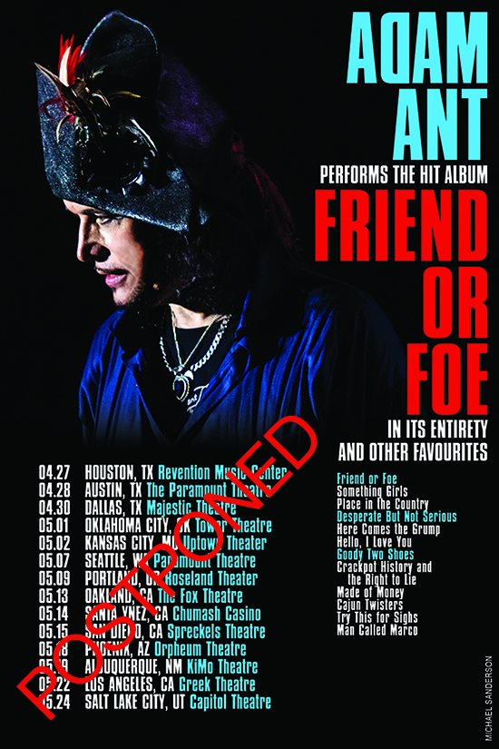 The Adam Ant: Friend or Foe Tour show originally scheduled for May 22 2021 at the Greek Theatre, Los Angeles