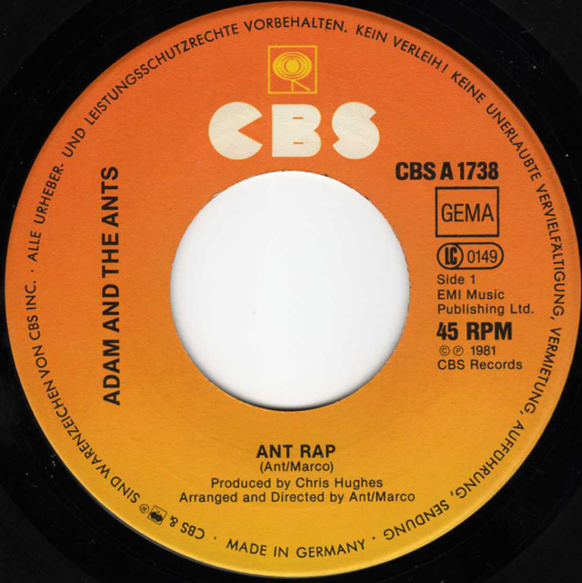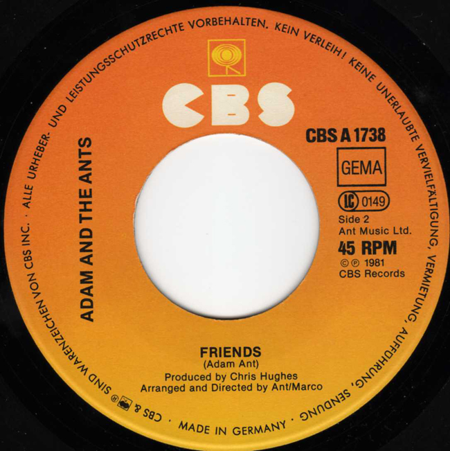 Adam and the Ants Country Label Catalogue Number Matrix numbers Format Release date A-side B-side The third single to be released from the Prince Charming album. The front and back covers of the single were taken by Allan Ballard. The B-side, Friends, is an old Ants song from 1978. The German single came in a sleeve printed in Holland (exactly the same as the Netherlands sleeve). |