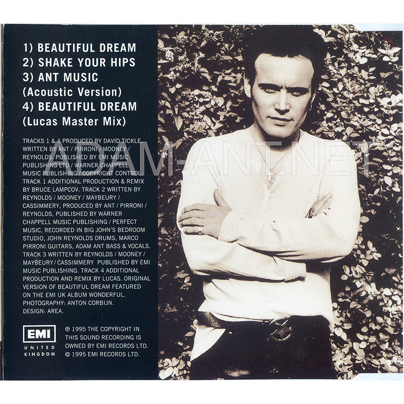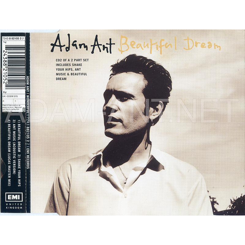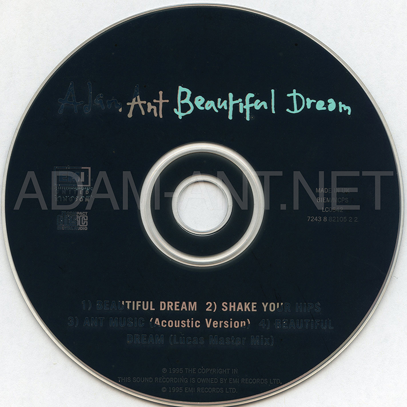 Adam Ant Country Label Catalogue Number Matrix numbers Format Release date Title track Other Tracks Originally scheduled as the second single to be released from the Wonderful album, Beautiful Dream was planned, recorded, mixed, artwork sorted, catalogue number allocated and pressed, but the single was then dropped and Gotta Be A Sin was released instead. Initial copies of the Beautiful Dream single were pressed and sent out to members of the band as well as a few press copies for review. The rest were destroyed and the single remains unreleased. The second CD of the scheduled 2 CD single release featuring and acoustic version of Antmusic recorded live on the BBC Radio Simon Mayo show |