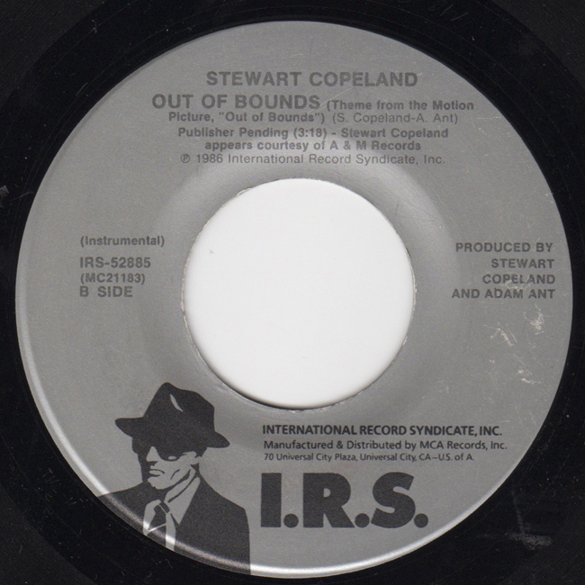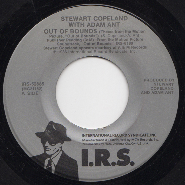 Adam Ant Country Label Catalogue Number Matrix numbers Format Release date Side 1 Side 2 US soundtrack 7" single for the Columbia Pictures film "Out of Bounds" featuring two versions of the song Out Of Bounds, one with lyrics, the other instrumental by Adam Ant and Stewart Copeland. |