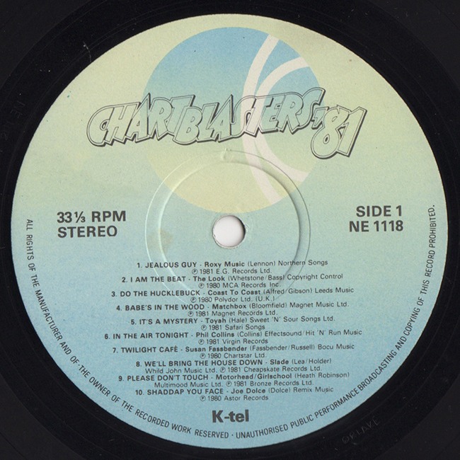 Side 1 Roxy Music - Jealous Guy The Look - I am the Beat Coast to Coast - Do the Hucklebuck Matchbox - Babe's in the Wood Toyah - It's a Mystery Phill Collins - In the Air Tonight Susan Fassbender - Twilight Cafe Slade - We'll Bring the House Down Motorhead/Girlschool - Please Don't Touch Joe Dolce - Shaddap you Face
