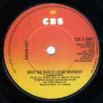 Adam Ant Country Label Catalogue Number Matrix numbers Format Release date A-side B-side The front, back and inner photographs of this gatefold sleeve were taken by Allan Ballard. The B-side, Why do Girls Love Horses?, is another old Ants song from 1978. The gatefold issue that some of these Irish singles came with are exactly the same as the UK release. |