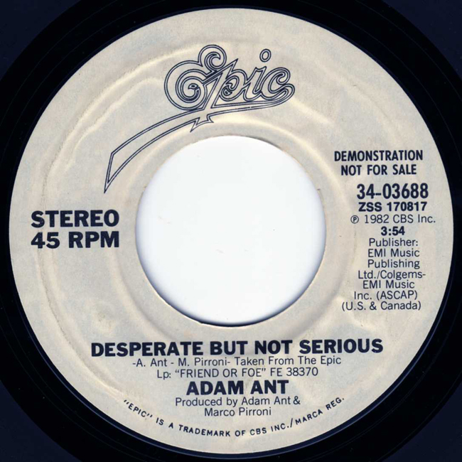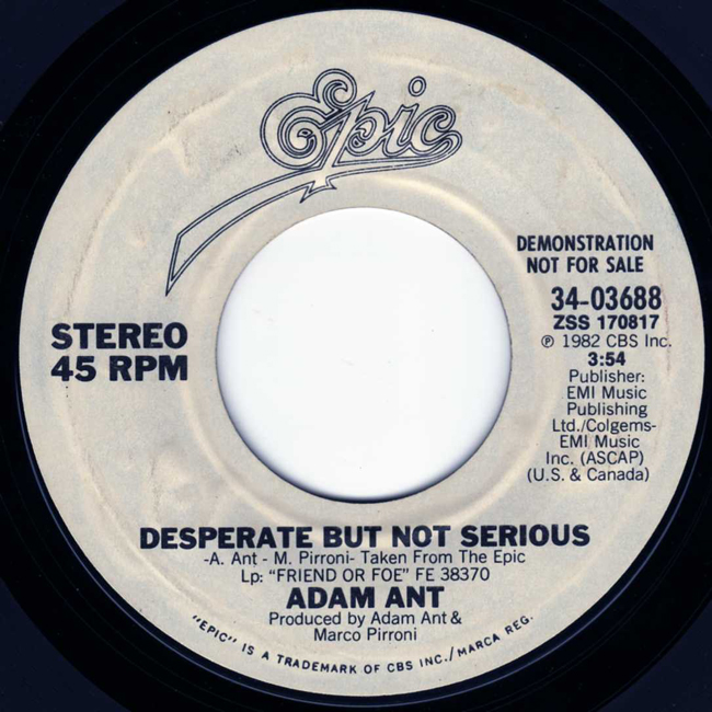 Adam Ant Country Label Catalogue Number Matrix numbers Format Release date A-side B-side This promotional release plays the title track on both sides. Issued with an Epic company sleeve. |