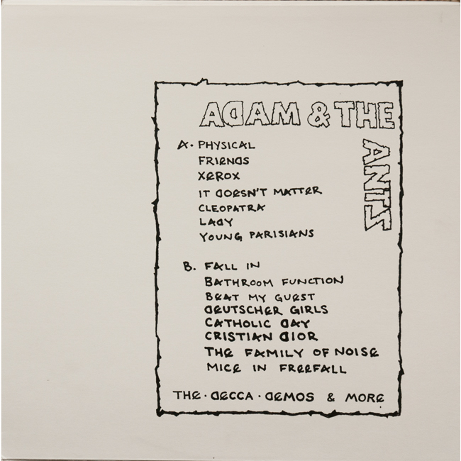 Adam and the Ants Country Label Catalogue Number Matrix number Format Release date Side 1 Side 2 adam-ant.net does not condone or encourage unofficial releases. A rehash of the Adam and the Ants Decca Demos from the Madam Stan bootleg and a few other tracks released in 2011 15 tracks ranging from 1977 to 1979 including 10 1978 Decca demos. The centre label of the record has been spray painted in black to cover up the fact that originally the labels used were for The Birthday Party - Welcome to the Car Smash bootleg (pictured below)