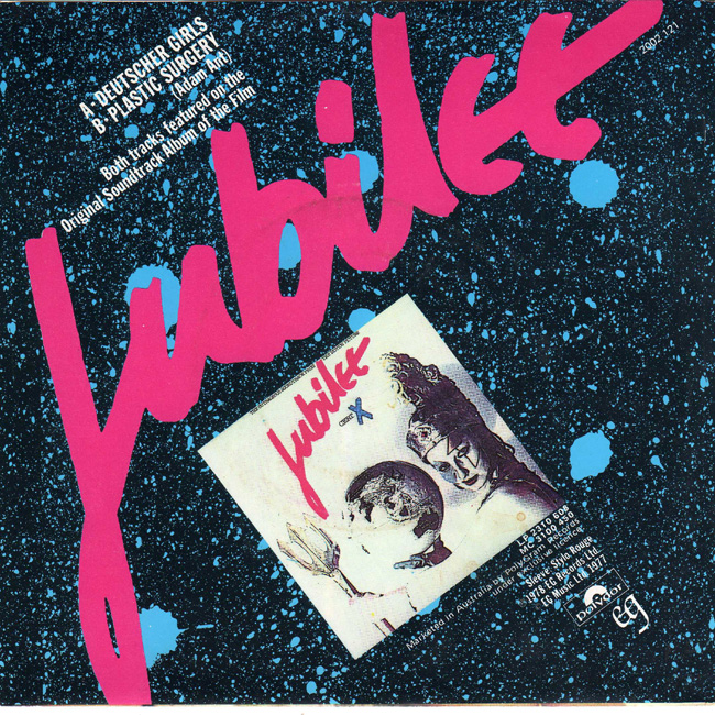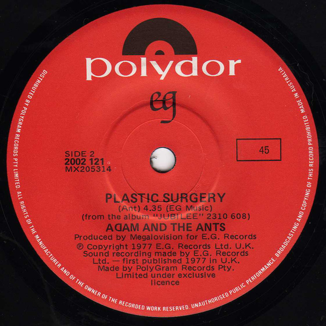 Adam and the Ants Country Label Catalogue Number Matrix numbers Format Release date A-side B-side EG records capitalised on the success of Adam and the Ants and released the two recorded tracks from the Jubilee soundtrack, 1978. The Australian pressing was issued red paper Polydor labels. |