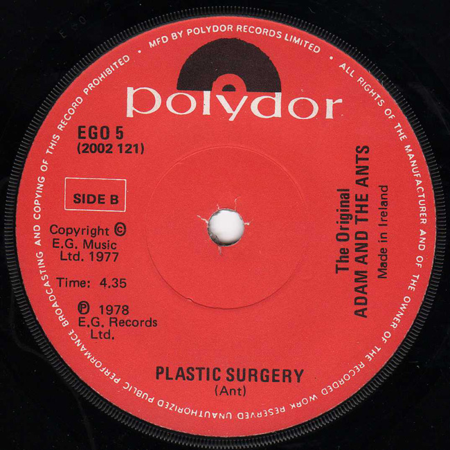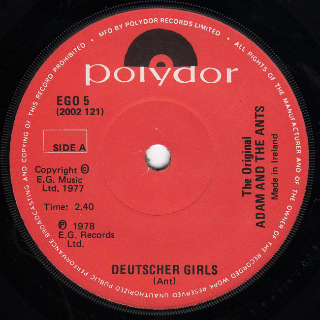 Adam and the Ants Country Label Catalogue Number Matrix numbers Format Release date A-side B-side EG records capitalised on the success of Adam and the Ants and released the two recorded tracks from the Jubilee soundtrack, 1978. The Irish pressing was issued in a generic Polydor company sleeve and the labels were red paper. |