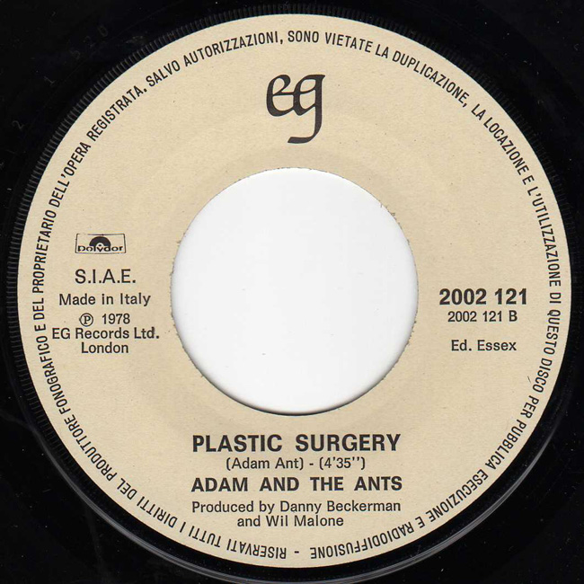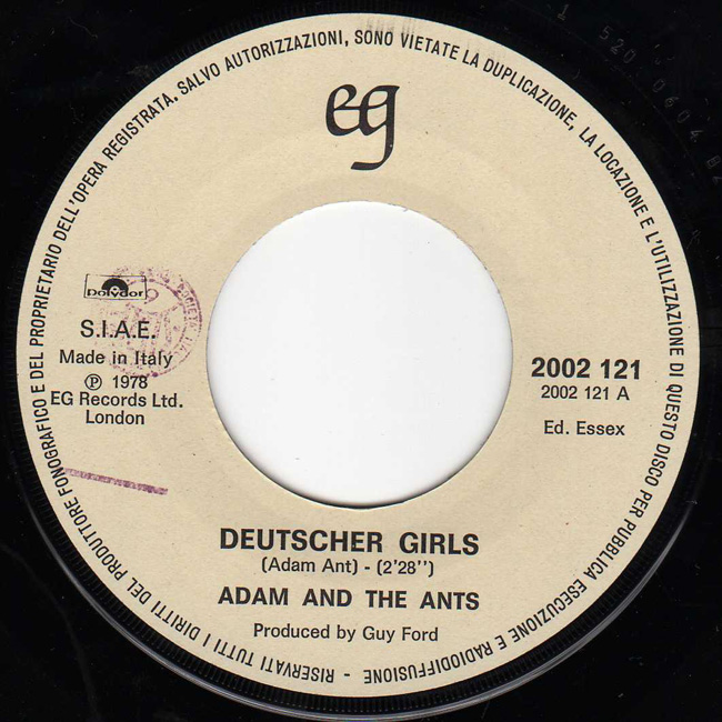 Adam and the Ants Country Label Catalogue Number Matrix numbers Format Release date A-side B-side EG records capitalised on the success of Adam and the Ants and released the two recorded tracks from the Jubilee soundtrack, 1978. The front cover is a still from the Derek Jarman film Jubilee of Adam (Kid) and Nell Campbell/Little Nell (Crabs). This Italian promotional copy is stamped on the label and has the words CAMPIONE GRATUITO (free sample) stamped into the sleeve. |