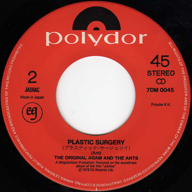 Adam and the Ants Country Label Catalogue Number Matrix numbers Format Release date A-side B-side EG records capitalised on the success of Adam and the Ants and released the two recorded tracks from the Jubilee soundtrack, 1978, through Polydor k.k. in Japan (the KK after the label name stands for kabushiki kaisha which is the Japanese abbreviation for Co Ltd). The front cover is a still from the Derek Jarman film Jubilee of Adam (Kid) and Nell Campbell/Little Nell (Crabs). The translation of the lyrics is also not exact on the back of the sleeve. |