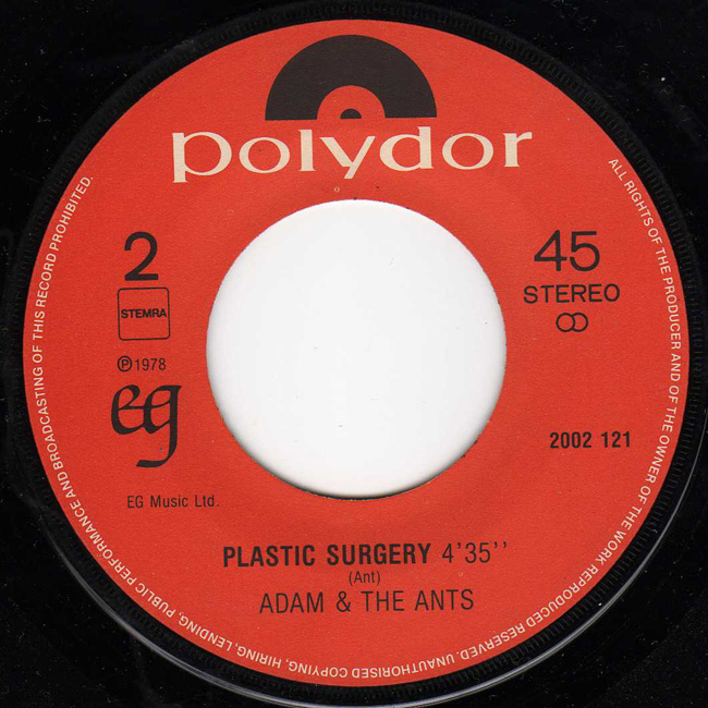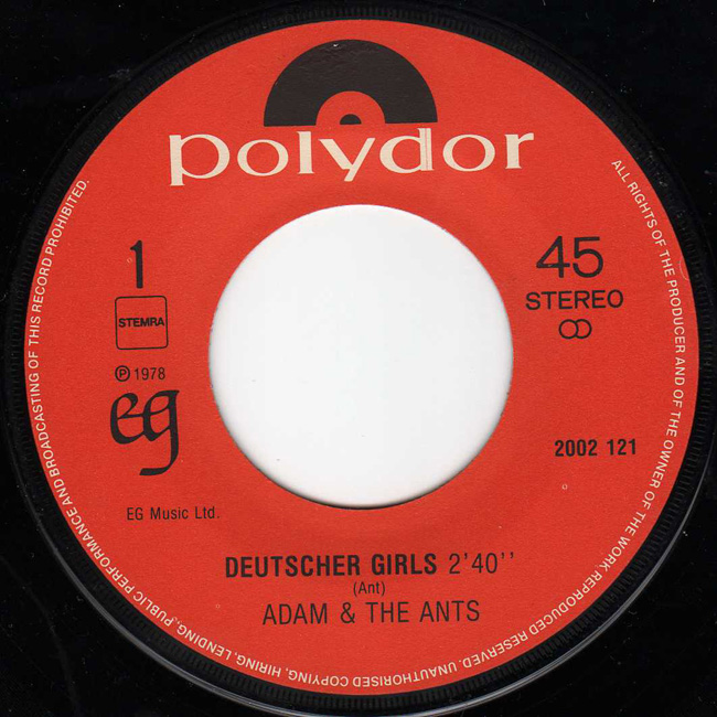 Adam and the Ants Country Label Catalogue Number Matrix numbers Format Release date A-side B-side EG records capitalised on the success of Adam and the Ants and released the two recorded tracks from the Jubilee soundtrack, 1978. The front cover is a still from the Derek Jarman film Jubilee of Adam (Kid) and Nell Campbell/Little Nell (Crabs). EG records marketed through Polydor |