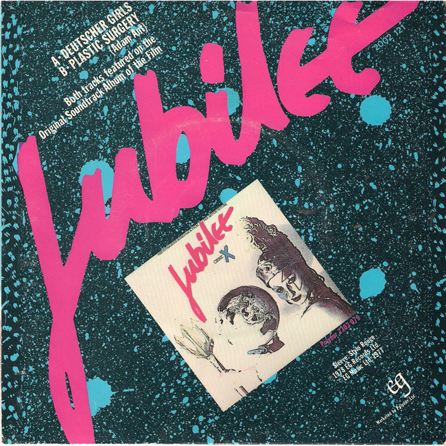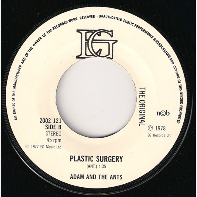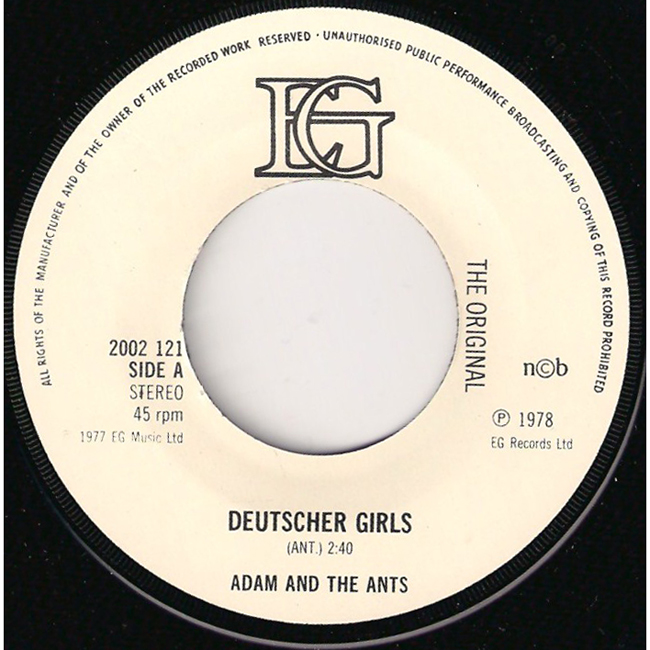 Adam and the Ants Country Label Catalogue Number Matrix numbers Format Release date A-side B-side The Swedish copy of the single is one of the most collectable versions of this release and is easily identified by its white label with the large EG letters at the top as well as having the words "The original" written to the right side of the centre hole, which are both unique to this pressing. EG records capitalised on the success of Adam and the Ants and released the two recorded tracks from the Jubilee soundtrack, 1978. The front cover is a still from the Derek Jarman film Jubilee of Adam (Kid) and Nell Campbell/Little Nell (Crabs). EG records marketed through Polydor |