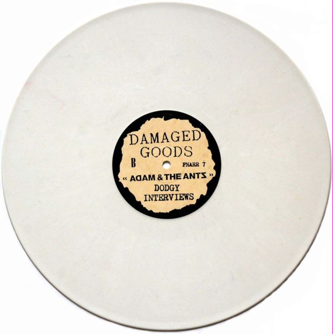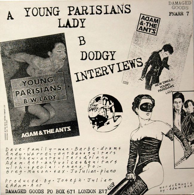 Adam and the Ants Country Label Catalogue Number Matrix numbers Format Release date A-side B-side This 12" record was released in 1989 in two formats, this the white vinyl and also a limited edition picture disc. Licensed from Decca, London based record label Damaged Goods put the two sides of the original single on the A side of this disc and two interviews on the B side, the first being from Zerox fanzine which was done in Chelmsford 4th February 1979. The second interview was done for Pogo fanzine in Italy which was done after the band's performance in Milan 17th October 1978 The A side plays at 45rpm and the B side plays at 33rpm The white vinyl also came with 6xA4 page sized fanzine with images taken from the Ant Catalogue, the Italian single cover for Parisians and two pages from Mick Mercer's Panache fanzine. |
