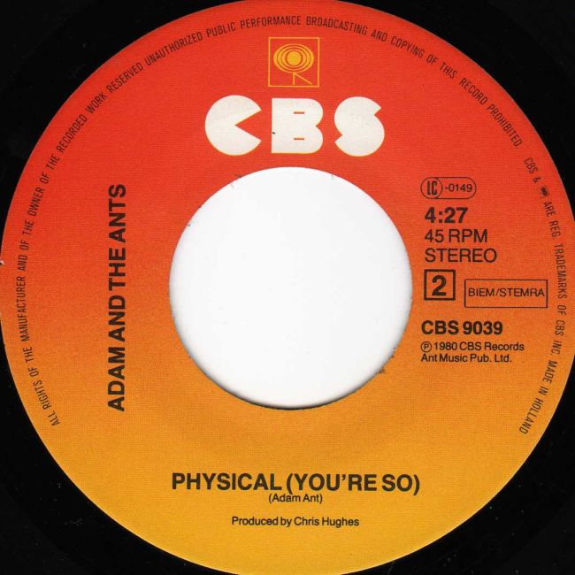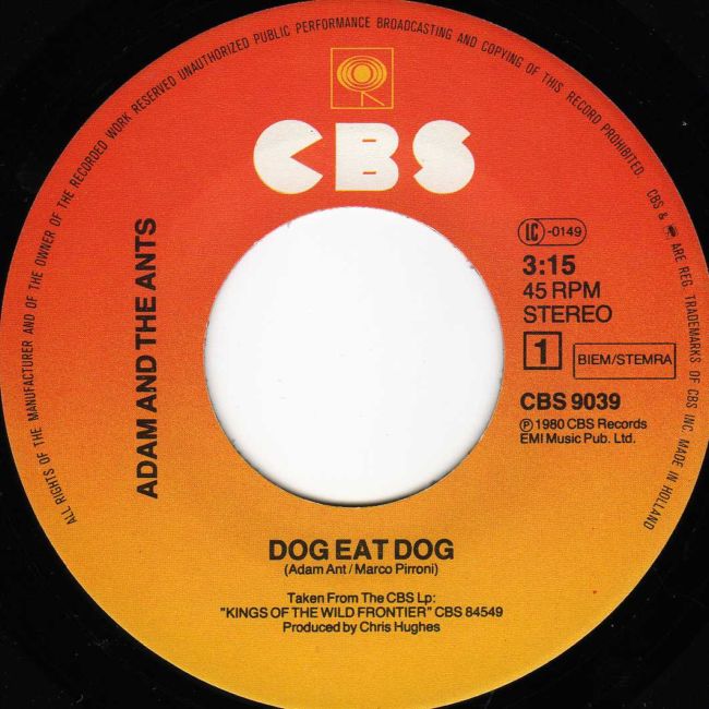 Adam and the Ants Country Label Catalogue Number Matrix numbers Format Release date A-side B-side The thin textured glossy paper sleeve is a direct copy, if not a photograph, of the UK sleeve. |