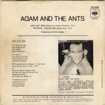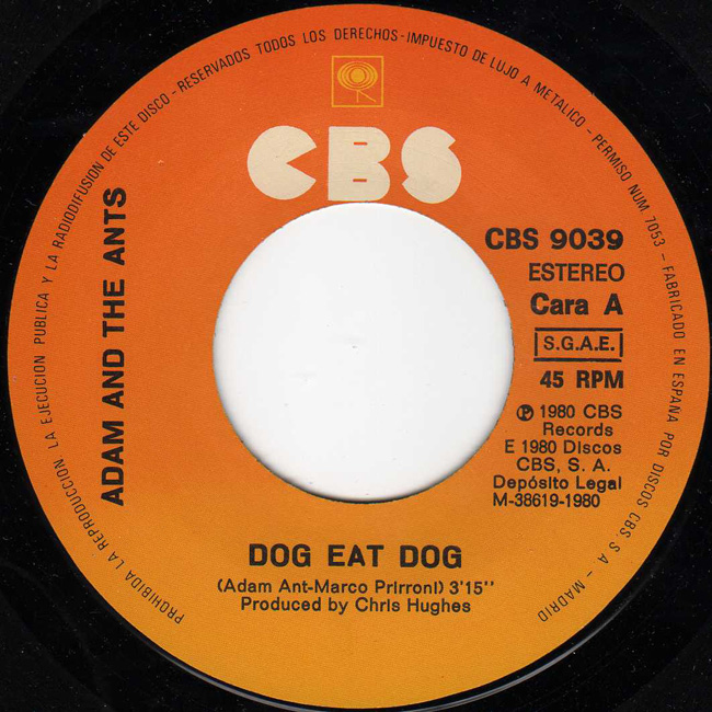 Adam and the Ants Country Label Catalogue Number Matrix numbers Format Release date A-side B-side The back of the single has the lyrics to Dog Eat Dog and advertises the Kings of the Wild Frontier album. |