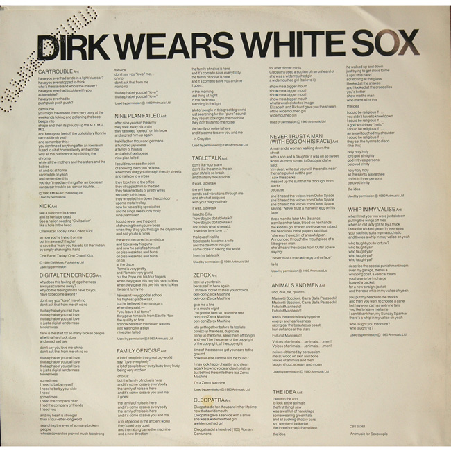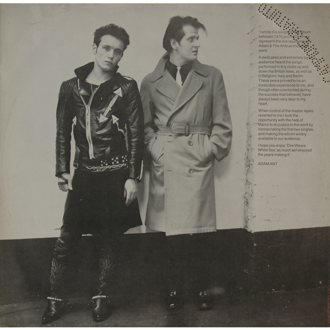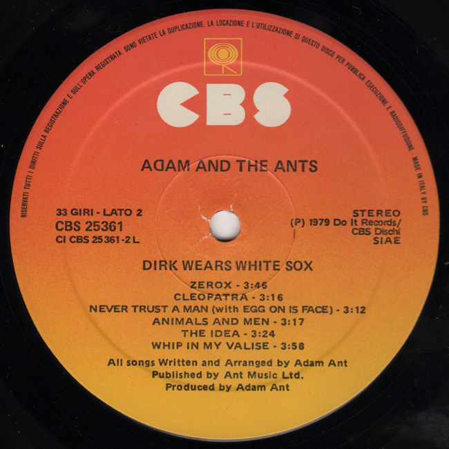 Adam and the Ants Country Label Catalogue Number Matrix numbers Format Release date Side 1 Side 2 Adam and the Ants debut album repackaged and released on CBS in 1983. This version of the Dirk album featured the two Do It singles, Zerox & Cartrouble plus their B-Sides, but in doing so had excluded the tracks Day I Met God, the original LP versions of Cartrouble Parts 1 & 2 and Catholic Day. The Italian promo has the words CAMPIONE GRATUITO (Free Sample) pressed out of the inner and outer sleeves. |