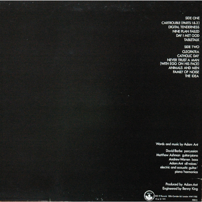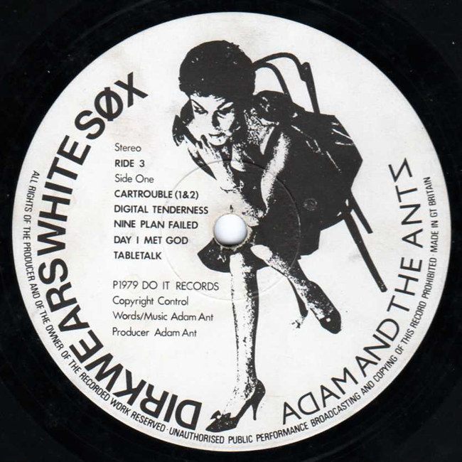 Adam and the Ants Country Label Catalogue Number Matrix numbers Format Release date Side 1 Side 2 Adam and the Ants debut album recorded and released in 1979. This second pressing of the album had a woman sitting on a chair on both labels rather than the Do-it speaker logo. |