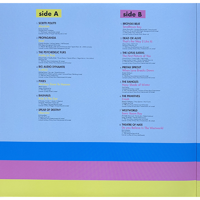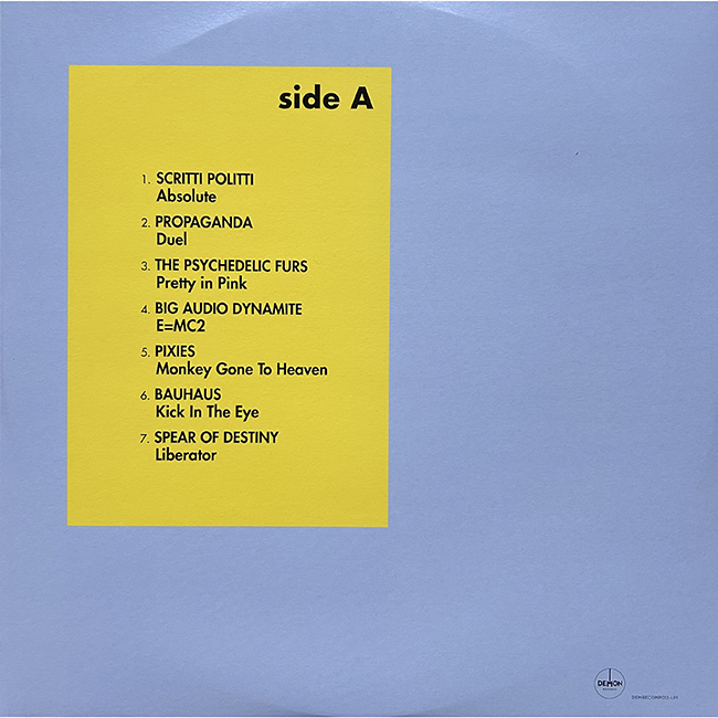 Side 1 Scritti Politti - Absolute Propaganda - Duel The Psychedelic Furs - Pretty in Pink Big Audio Dynamite - E=MC2 Pixies - Monkey Gone to Heaven Bauhaus - Kick in the Eye Spear of Destiny - Liberator