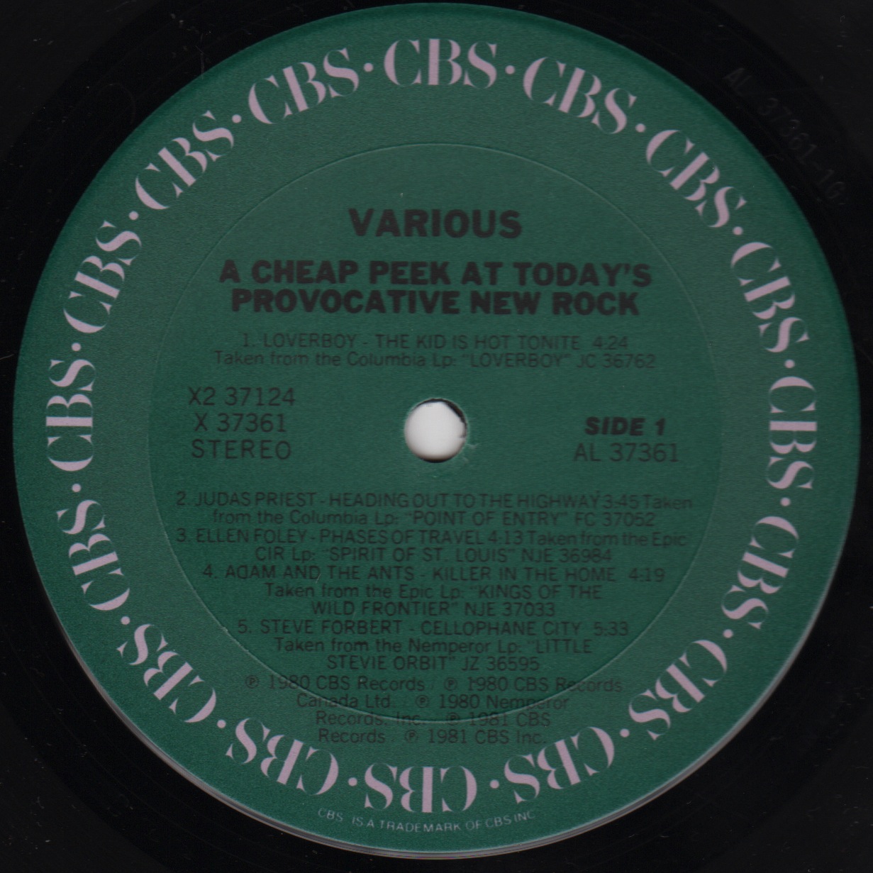 Side 1 Loverboy - The Kid is Hot Tonite Judas Priest - Heading out to the Highway Ellen Foley - Phases of Travel Adam and the Ants - Killer in the Home Steve Forbert - Cellophane City