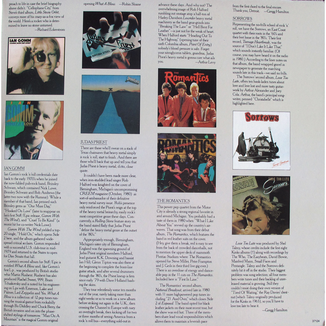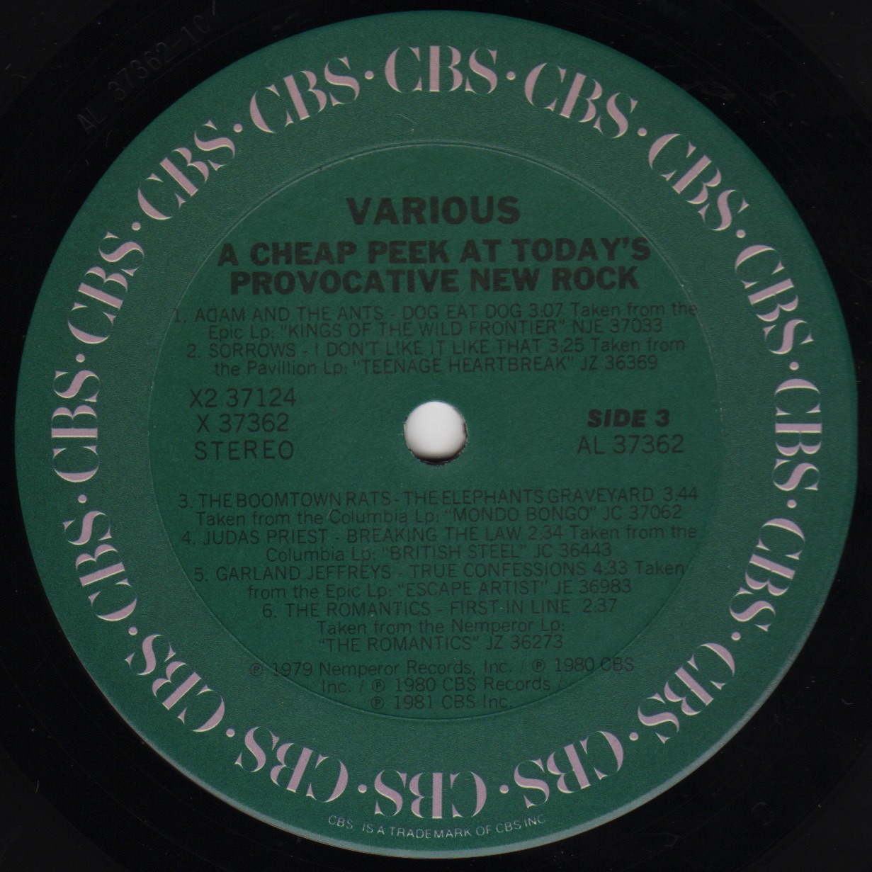 Side 3 Adam and the Ants - Dog Eat Dog Sorrows - I Don't Like it Like That The Boomtown Rats - The Elephants Graveyard Judas Priest - Breaking the Law Garland Jeffreys - True Confessions The Romantics - First in Line