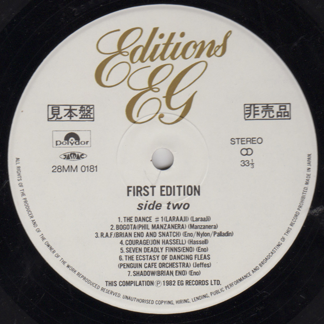 Adam and the Ants Country Label Catalogue Number Matrix numbers Format Release date Side 1 Side 2 UK compilation album from EG records capitalising in on the recent Adam and the Ants success featuring the reworked "nasty" version of Deutscher Girls The Japanese version of the First Edition LP has replaced the Brian Eno/David Byrne track Very, Very Hungry with Brian Eno's Seven Deadly Finns This Promo can be identified by the symbols (marked here with a red outline) printed on the label below:
