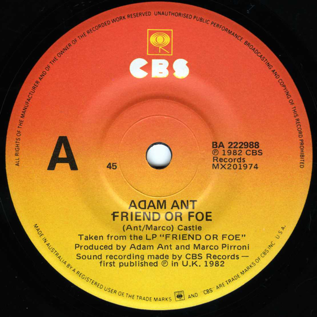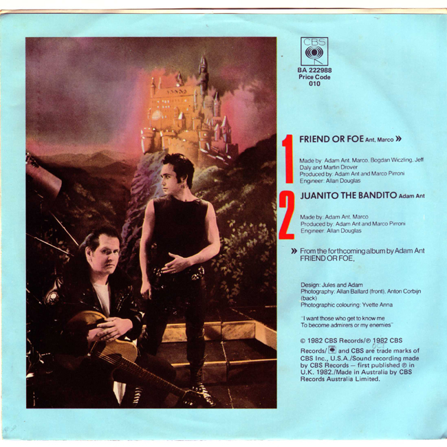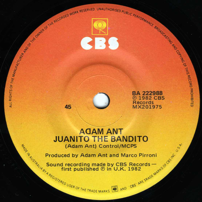 Adam Ant Country Label Catalogue Number Matrix numbers Format Release date A-side B-side The Australian sleeve misses off the album release date (which is on the UK sleeve). The B-side, Juanito the Bandito, is an old Ants song from 1977. |
