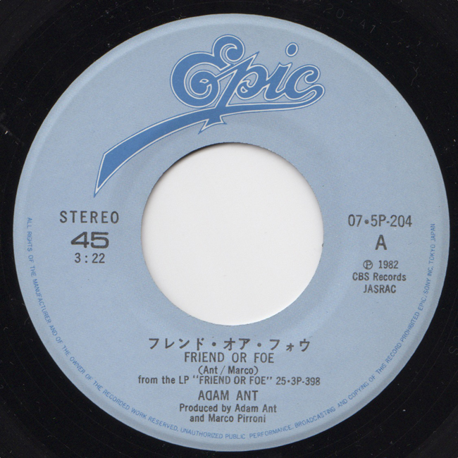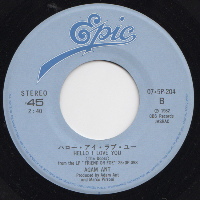 Adam Ant Country Label Catalogue Number Matrix numbers Format Release date A-side B-side The B-side Hello, I Love You is a Doors song taken from the Friend or Foe album. |