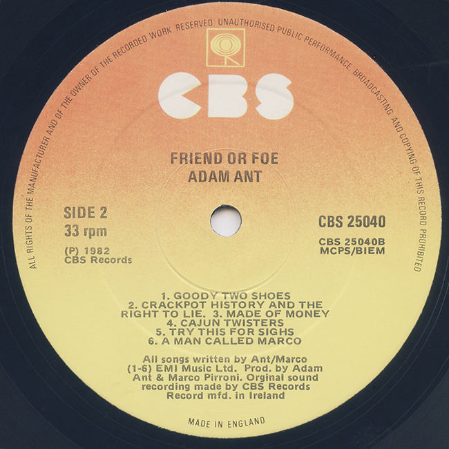 Adam Ant Country Label Catalogue Number Matrix numbers Format Release date Side 1 Side 2