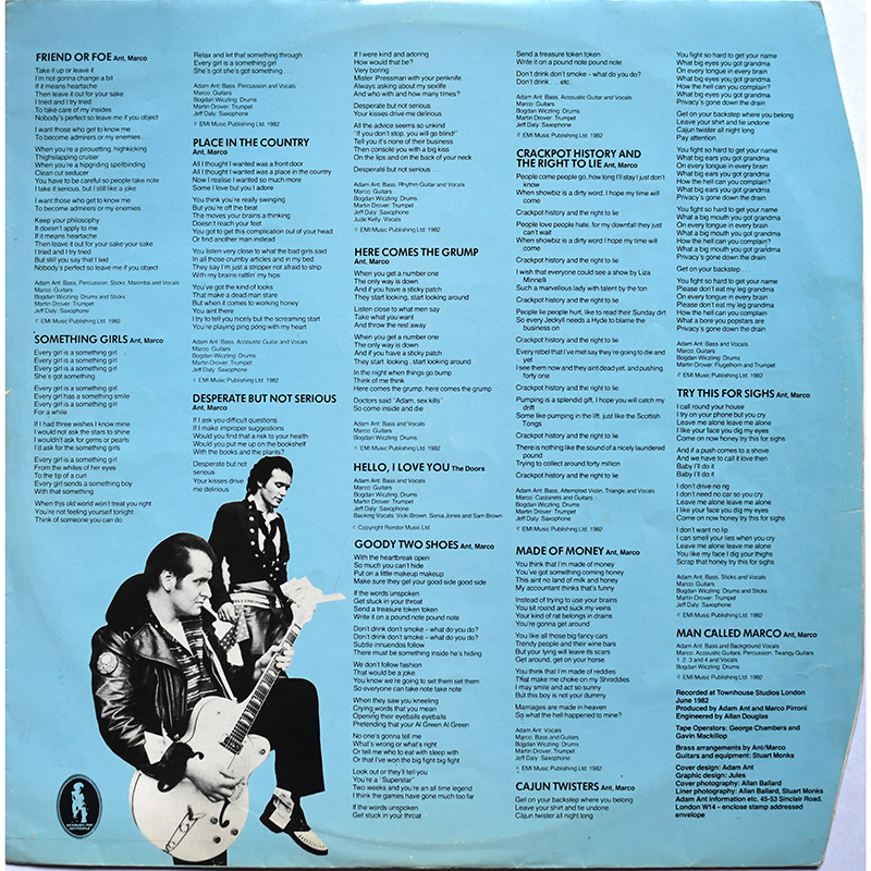 Adam Ant 1982 and Adam has gone solo after the success of the Prince Charming Revue The cover photos, by Allan Ballard, are stills from Adam's performance on the UK ITV show The Cannon and Ball Show ![]() |