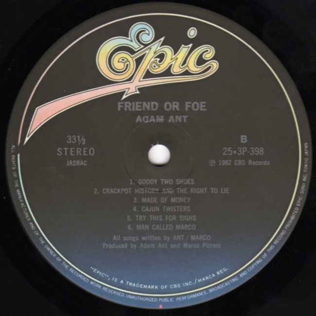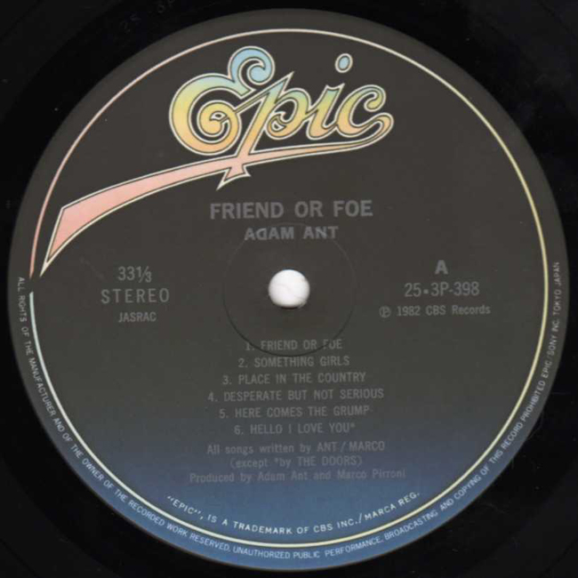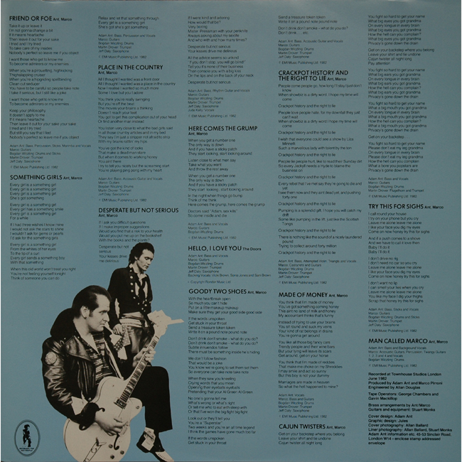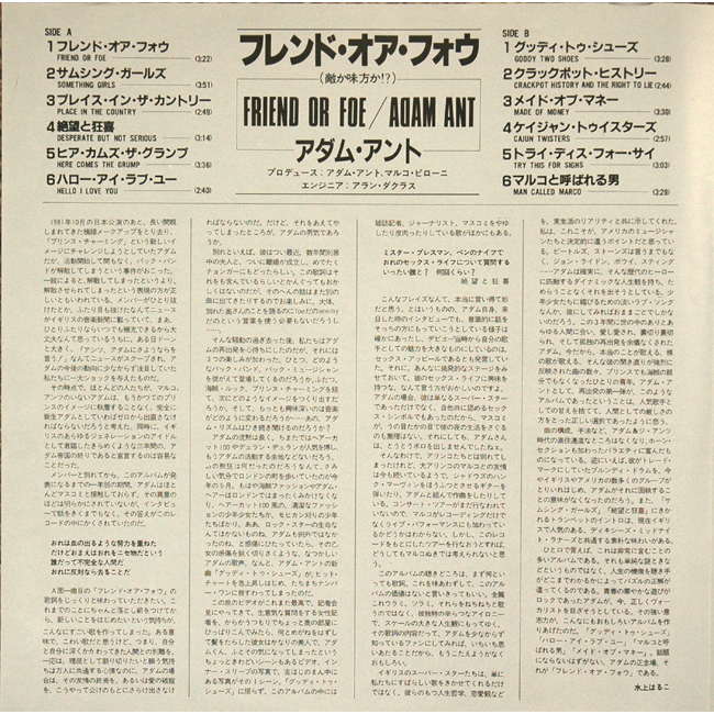 Adam Ant 1982 and Adam has gone solo after the success of the Prince Charming Revue The cover photos, by Allan Ballard, are stills from Adam's performance on the UK ITV show The Cannon and Ball Show The Japanese album has the Obi strip around the outside of the sleeve, this details the price, catalogue number and other details used in ordering vinyl. |