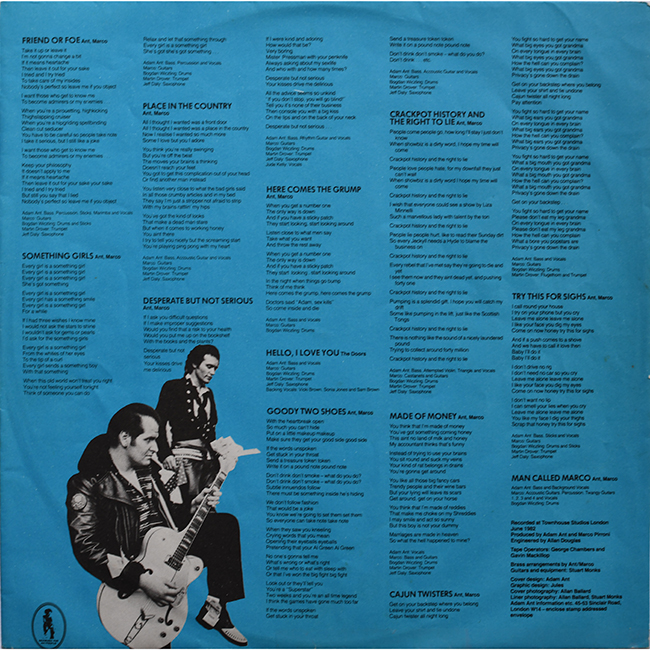 Adam Ant 1982 and Adam has gone solo after the success of the Prince Charming Revue The cover photos, by Allan Ballard, are stills from Adam's performance on the UK ITV show The Cannon and Ball Show This South African LP was marketed and distributed by Gramophone Record Co (Pty) Ltd |