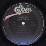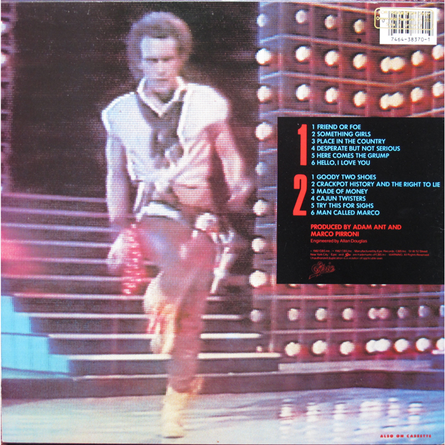 Adam Ant 1982 and Adam has gone solo after the success of the Prince Charming Revue The cover photos, by Allan Ballard, are stills from Adam's performance on the UK ITV show The Cannon and Ball Show The album code for this release is prefixed with FE relating to the price code for this album release Promotional copies were gold stamped on the back of the sleeve |