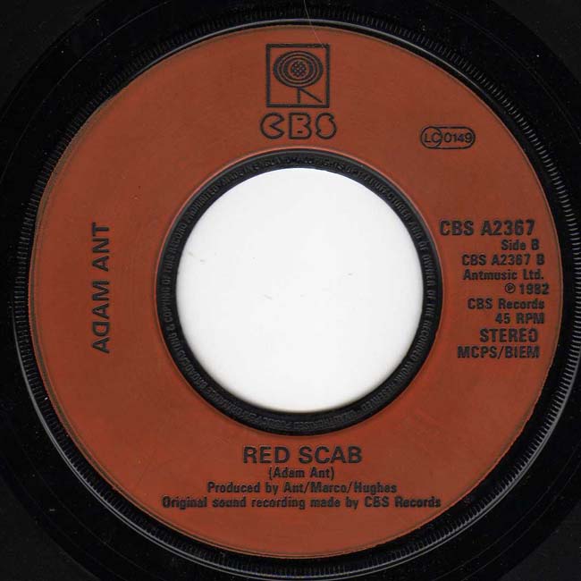 Adam Ant Country Label Catalogue Number Matrix numbers Format Release date A-side B-side The first single to be released as Adam Ant, the solo artist. The B-side, Red Scab, is an old Ants song from 1977. |