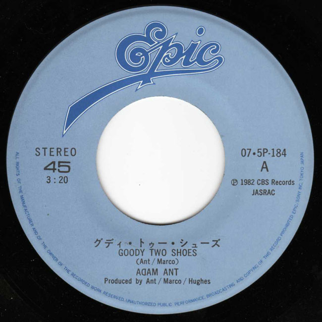 Adam Ant Country Label Catalogue Number Matrix numbers Format Release date A-side B-side The first single to be released as Adam Ant, the solo artist. The front photograph for the sleeve was taken by Allan Ballard. The B-side, Red Scab, is an old Ants song from 1977. The lyrics for Goody Two Shoes are correctly transcribed on the back of the sleeve. |