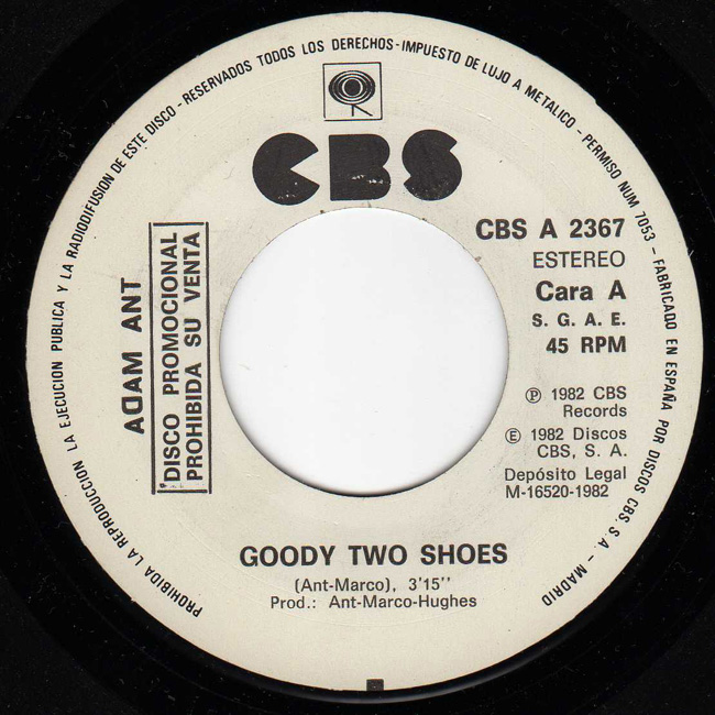 Adam Ant Country Label Catalogue Number Matrix numbers Format Release date A-side B-side Single sided white label promo The first single to be released as Adam Ant, the solo artist. This generic CBS sleeve states that it is Especial Dicotecas Verano '82 (Summer Special Clubs '82) |
