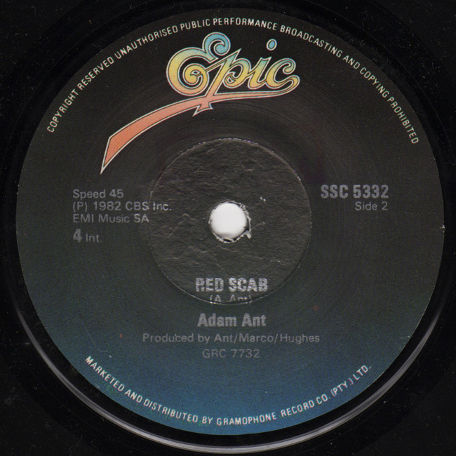Adam Ant Country Label Catalogue Number Matrix numbers Format Release date A-side B-side The first single to be released as Adam Ant, the solo artist. Zimbabwean release issued on the Epic label and distributed through the Gramophone Record Company (PTY) Ltd in South Africa |
