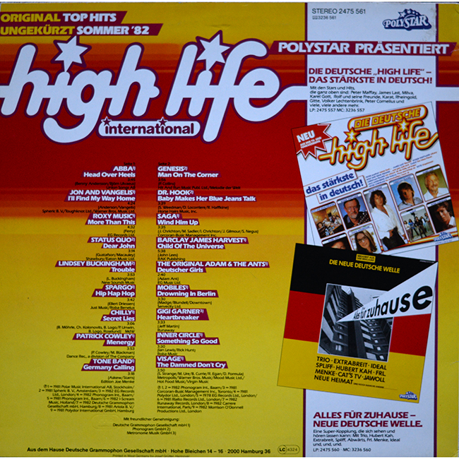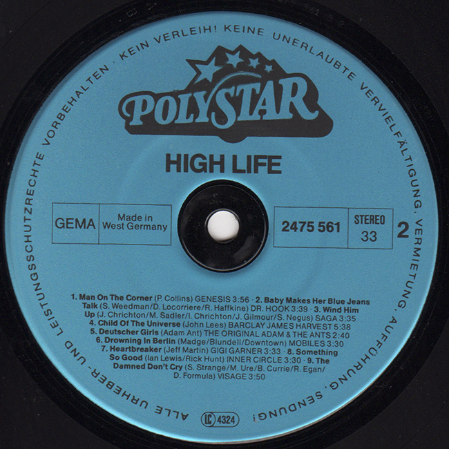 Side 2 Genesis - Man on the Corner Dr Hook - Baby Makes Her Blue Jeans Talk Saga - Wind Him Up Barclay James Harvest - Child of the Universe Adam and the Ants - Deutscher Girls Mobiles - Drowning in Berlin Gigi Garner - Heartbreaker Inner Circle - Something So Good Visage - The Damned Don't Cry