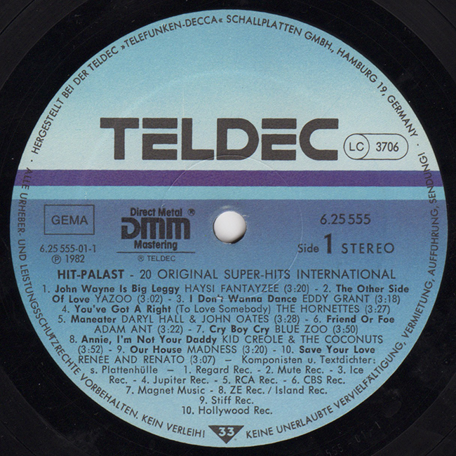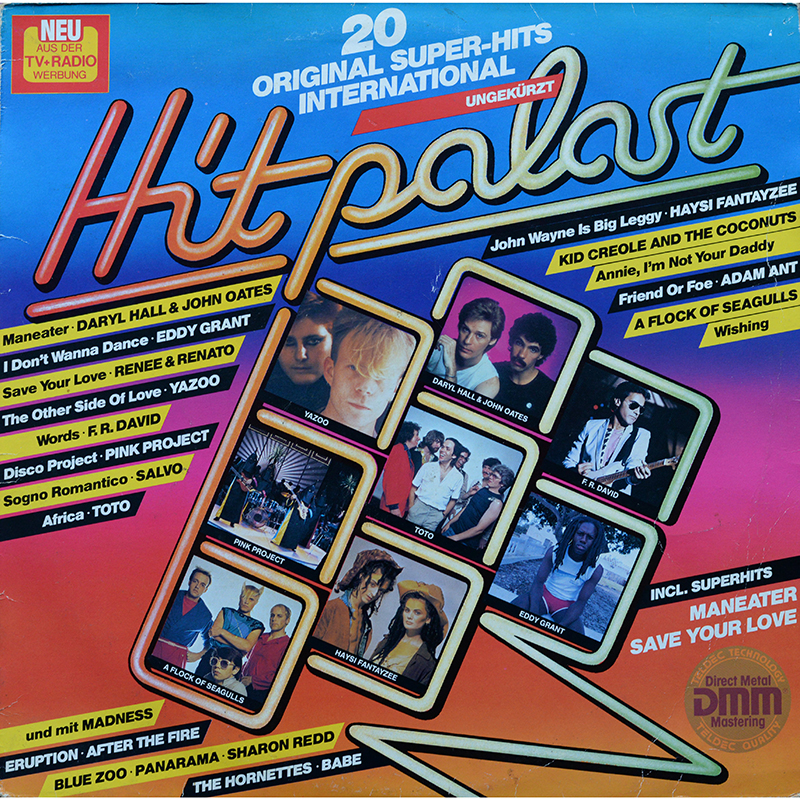 Side 1 Haysi Fantayzee - John Wayne is Big Leggy Yazoo - The Other Side of Love Eddy Grant - I Don't Wanna Dance Hornettes - You've Got A Right (To Love Somebody) Daryl Hall & John Oates - Maneater Adam Ant - Friend or Foe Blue City - Cry Boy Cry Kid Creole & The Coconuts - Annie, I'm Not Your Daddy Madness - Our House Renee & Renato - Save Your Love