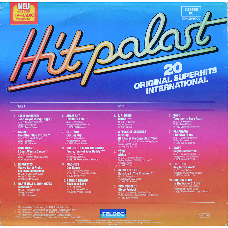 Side 2 F.R. David - Words A Flock of Seagulls - Wishing (If I Had A Photographs of You) Toto - Africa After the Fire - Dancing in the Shadows Pink Project - Disco Project Babe - Together in Love Again Panarama - I Believe in You Salvo - Sogno Romantico Eruption - Joy to The World Sharon Redd - In The Name of Love