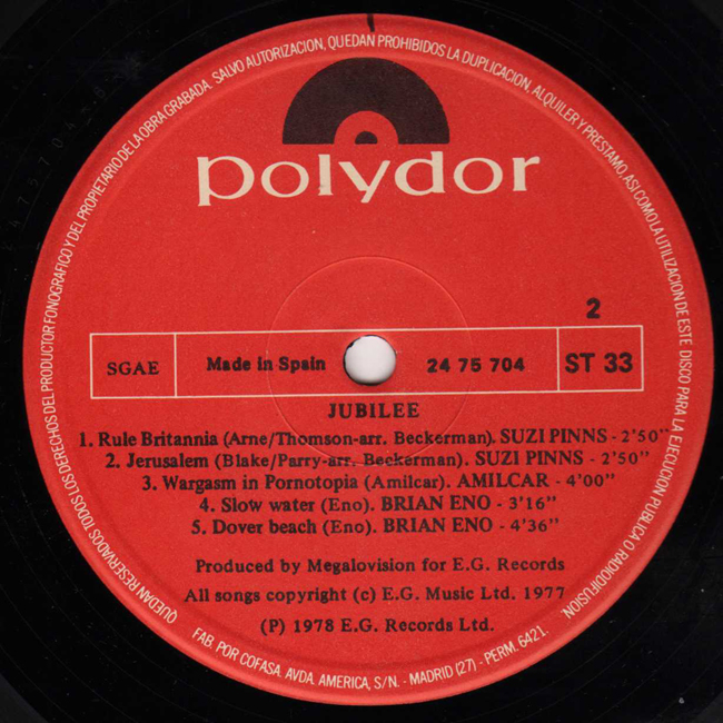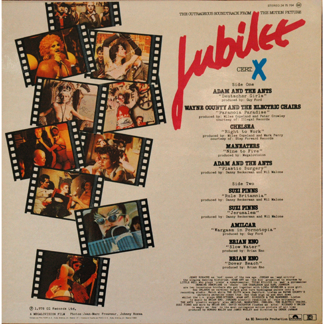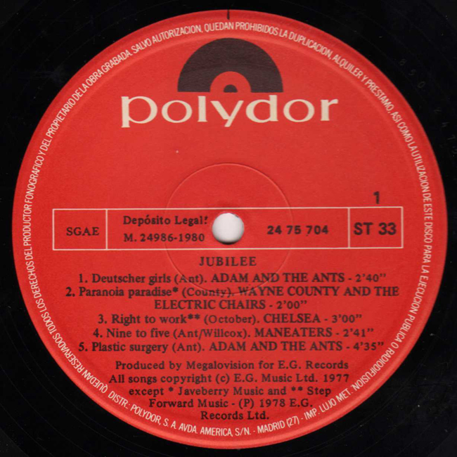 Adam and the Ants Country Label Catalogue Number Matrix numbers Format Release date Side 1 Side 2 The first vinyl release for Adam and the Ants, two tracks on the film soundtrack for Jubilee The Outrageous Soundtrack from the Motion Picture The spanish release of the album came with a glossy outer sleeve (unlike the matte UK release) and a standard Polydor red label rather than the special Jubilee logo as per the UK release. Adam and Dave Barbe are also featured on the Maneaters track Nine to Five with Dave playing drums and Adam providing guitar, bass, harmonica and backing vocals to Toyah's lead. The Suzi Pinns track Jerusalem was mimed by Jordan who played the character Amyl Nitrate in the film. |