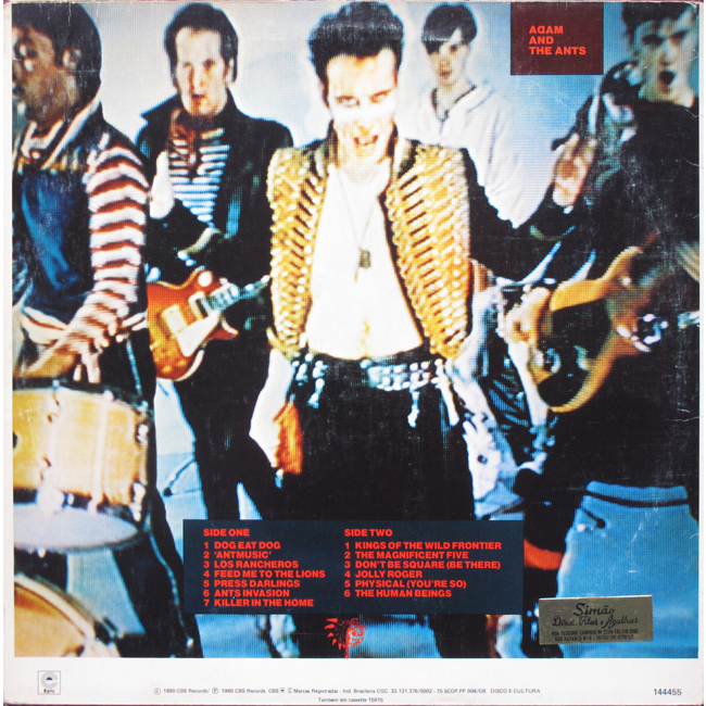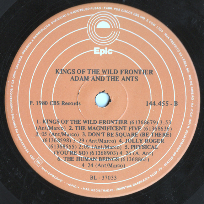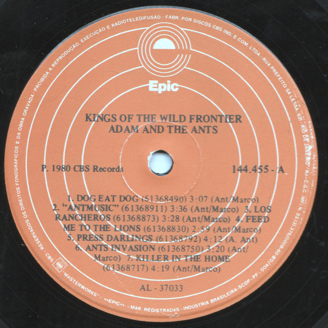 Adam Ant Recorded at Rockfield Studio in Monmouth, Wales in August 1980, this new 5 piece band were to produce one of the most iconic albums of the 80s The front and back cover of this album are photographs taken from the monitor during the filming of the Kings of the Wild Frontier video in early August 1980 The Brazilian version of the album changes the running order of the tracks (the same as the US release) on side 1 by swapping Feed me the the Lions and Los Rancheros around and then adding the song Press Darlings which was originally the B-Side to the UK release of the single Kings of the Wild Frontier. |