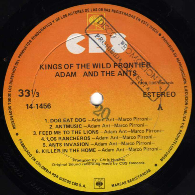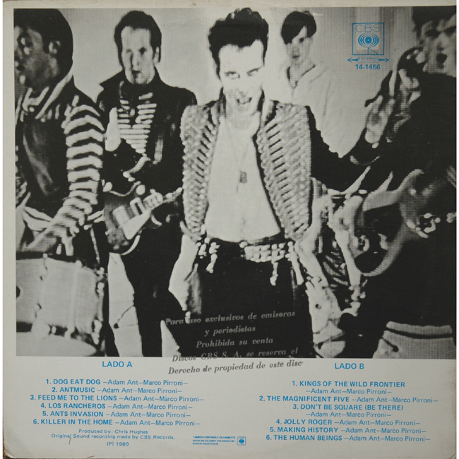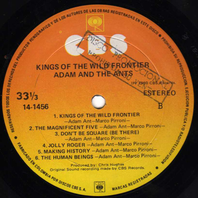 Adam Ant Recorded at Rockfield Studio in Monmouth, Wales in August 1980, this new 5 piece band were to produce one of the most iconic albums of the 80s The front and back cover of this album are photographs taken from the monitor during the filming of the Kings of the Wild Frontier video in early August 1980 Another South American release, this Columbian promo is stamped on the label and on the back sleeve Disco Promocional prohibida su venta |