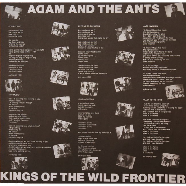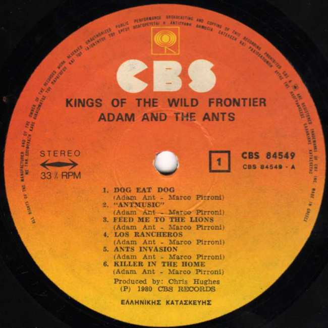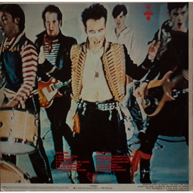 Adam Ant Recorded at Rockfield Studio in Monmouth, Wales in August 1980, this new 5 piece band were to produce one of the most iconic albums of the 80s The front and back cover of this album are photographs taken from the monitor during the filming of the Kings of the Wild Frontier video in early August 1980 The outer sleeve for the Greek release had additional text on the back (pictured below) and the inner lyric sheet was printed in black and white.