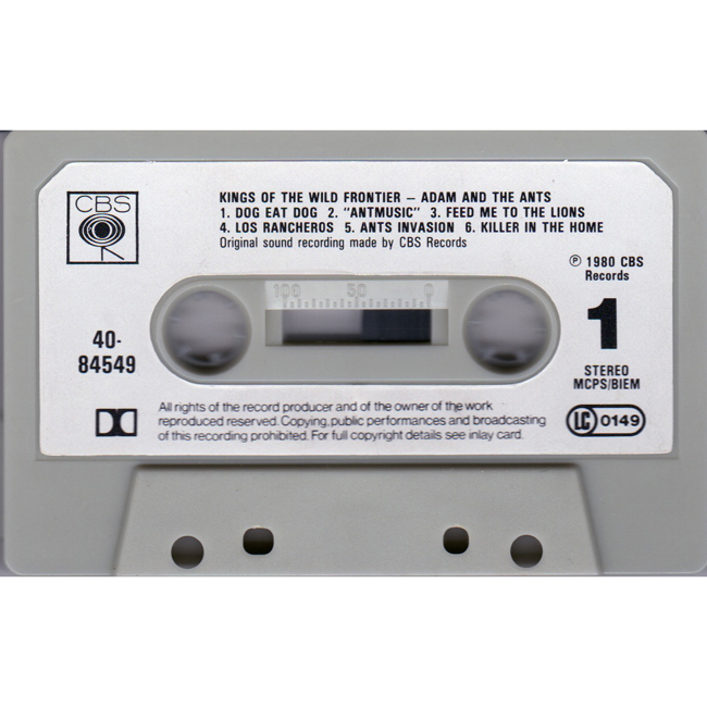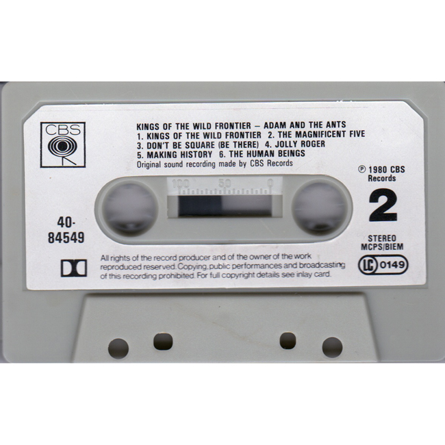 Adam Ant Recorded at Rockfield Studio in Monmouth, Wales in August 1980, this new 5 piece band were to produce one of the most iconic albums of the 80s The front and back cover of the album are photographs taken from the monitor during the filming of the Kings of the Wild Frontier video in early August 1980 There are at least four versions of the UK cassette, one with black text on the cassette (with two different inlay sleeves), another where the text is in red and this one with paper labels |